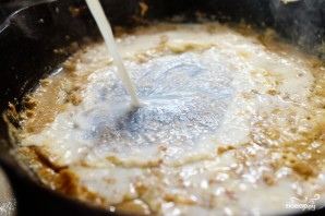 На этом приготовление можно закончить, однако мы приготовим еще и соус. В ту сковороду, где жарились пальчики, добавляем муку. Быстро взбивая венчиком, обжариваем ее до однородной густой золотистой массы (как на фото).