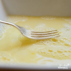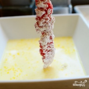 Затем каждый говяжий пальчик обмакиваем в яичную смесь.