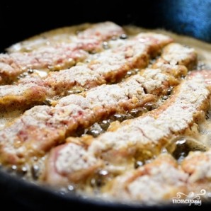 Говядину рубим на длинные полосочки. Каждую полосочку хорошенько обваливаем в сухой смеси.
