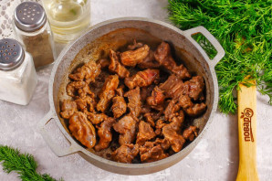 Влейте в казан 1 ст.л. растительного масла и обжарьте в нем кусочки говядины. Они сначала выпустят сок, затем потушите их примерно 10-15 минут до его испарения. Потом лишь говядина обжарится.