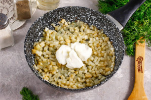 Выложите сметану любой жирности и перемешайте. По желанию можете добавить измельченный пармезан. Протомите ризотто буквально минуту.
