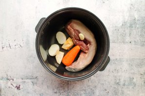 Тщательно вымойте язык, выложите его в чашу скороварки. Если он не помещается даже в свернутом состоянии, язык можно разрезать. Чистим лук и морковь, разрезаем луковицу пополам, а морковь на 4 части вдоль. Добавляем к языку.