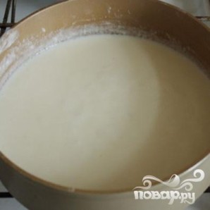 2. Оливковое масло разогреваем в большом сотейнике. Когда масло разогреется, добавляем сюда муку, и постоянно помешивая, жарим примерно одну минуту. Теперь начинаем вливать понемногу молоко, постоянно при этом помешиваем. Получиться должна однородная густоватая масса.