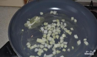 3. Отрежьте брусочек сливочного масла, положите его на сковороду. Количество масла выбирайте с учетом особенностей вашей сковороды. В растаявшее масло добавьте лук. Обжарьте лук до получения золотистого оттенка.