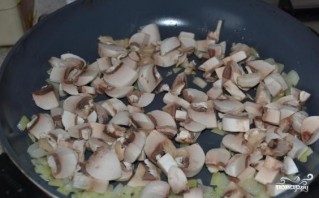 4. Положите на сковороду к луку шампиньоны. Оставьте продукты тушиться на сковороде при небольшом огне на 8 минут. Все время помешивайте.