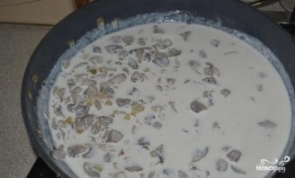 6. Сливки предварительно налейте в кастрюльку и подогрейте, до кипения доводить нет необходимости. Добавьте теплые сливки к грибам. Посолите. Накройте крышкой. Соус готов, когда мука со сливками становятся единым целым.