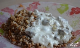 7. Добавьте в грибной соус чеснок, предварительно измельченный в чеснокодавке. Снимите с огня. Блюдо готово. Наслаждайтесь его вкусом.