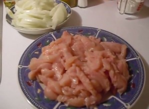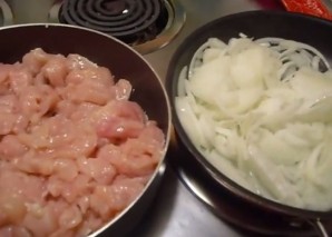 Жарим на подсолнечном масле курицу и лук на отдельных сковородках.