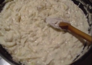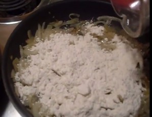 Когда лук станет золотистого цвета, добавляем в него муку, перемешиваем и жарим 2-3 минуты.