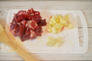 5. Мясо помойте и нарежьте кусочками среднего размера, яблоки - кубиками, чеснок - произвольно.