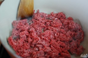В большой кастрюле обжариваем говяжий фарш.