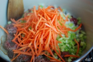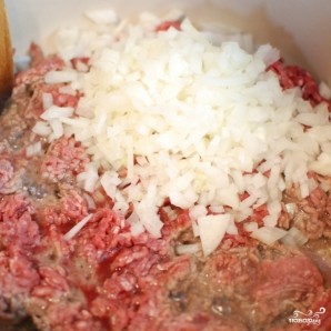 Когда фарш слегка подрумянится и станет выпускать жир, добавляем в кастрюлю мелко нарезанный лук.