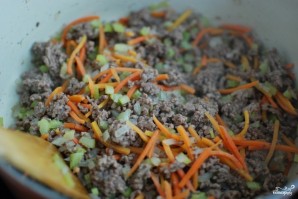 Перемешиваем и обжариваем до мягкости лука.