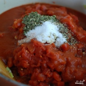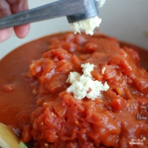 Сразу вслед за этим добавляем в кастрюлю томатную пасту и помидоры в собственном соку. При желании, можно добавить немножко томатного сока. Туда же добавляем измельченный чеснок.