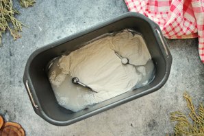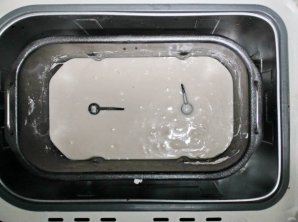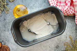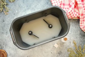 В теплой воде растворите свежие дрожжи, соль и сахар. Установите чашу в хлебопечку, вставьте вращающиеся лопасти и перелейте жидкость в чашу.