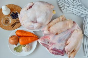 Свиные ножки замочите в воде на несколько часов, если есть запах, то добавьте немного уксуса, он его уберет. Вымойте рульку и курицу. Выложите чистое подготовленное мясо в большую кастрюлю (10-12 литров) и залейте чистой холодной водой.
