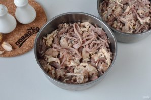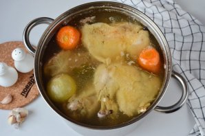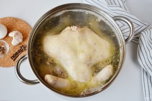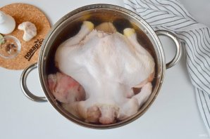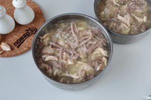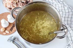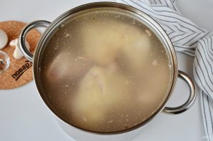 Удалите с бульона лавровый лист, перцы горошком и душистый. Достаньте мясо, отложите остывать, затем отделите от костей. В бульон добавьте пропущенный через пресс чеснок (3-4 крупных зубчика), отрегулируйте соль.