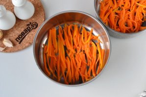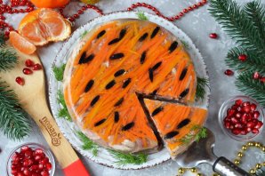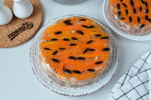 Поверх маслин выложите тертую на квадратной терке (терка для корейских овощей) морковь, имитируя шерсть тигра.