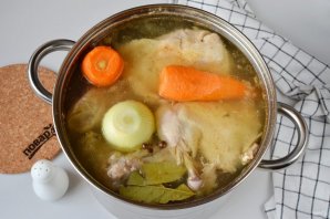 Спустя 5 часов добавьте очищенные морковь, лук, соль, лавровый лист, перец горошком черный и душистый. Варите еще 1 час. Если морковочки тонкие, то 30 минут варки им достаточно.