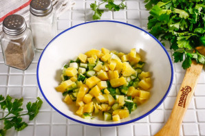 Очистите отварной картофель от кожуры и промойте его. Промойте огурцы, срежьте хвостики с обеих сторон. Нарежьте небольшими кубиками и высыпьте нарезки в салатник.