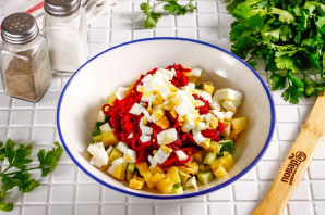 Очистите отварные куриные яйца от скорлупы и промойте их в воде. Отожмите свекольную массу от уксуса, но не промывайте! Выложите в салатник. Нарежьте куриные яйца кубиком и добавьте в емкость.