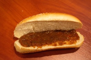 По срезу верхнюю и нижнюю часть булочки смажьте томатным соусом или аджикой. Я люблю острее и взяла сливовую аджику средней остроты.