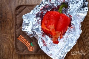 Перец помойте, заверните в фольгу, запекайте в духовке при 180 °С около 1 часа. Снимите кожицу, удалите семена.