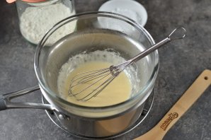 Переложите мед и неполную ложечку соды в глубокую миску, взбивайте венчиком на водяной бане до тех пор, пока масса не побелеет.