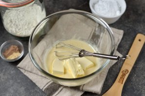 Сливочное масло нарежьте кусочками, переложите в миску в теплый мед. Продолжайте взбивать, пока масло полностью не раствориться.