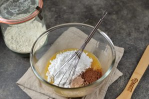 Добавьте все специи без горки, какао порошок для цвета и сахарную пудру. Вымесите все аккуратно, чтобы не образовались комочки.