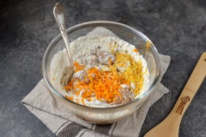 Натрите цедру небольшого апельсина и лимона на меленькой терке, переложите в миску вместе с мукой. Муку добавляйте постепенно, ее количество может зависеть от размера яйца. Подсыпьте сначала 300 грамм, замесите тесто, оно должно получиться очень мягким и эластичным. Если тесто клеится к рукам, тогда подсыпьте еще немного муки.