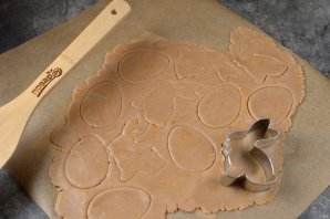 Дальше с тестом нужно работать быстро. Раскатайте имбирное тесто толщиной 3-4 миллиметра, вырубкой для печенья сделайте заготовки. Переложите заготовки на выстеленный пергаментом противень и отправьте их в предварительно разогретую до 180 градусов духовку на 10-12 минут в режиме "верх/низ". Противень установите ровно посередине духового шкафа.