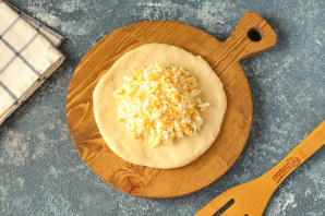 Каждую часть раскатайте в форме лепешки на присыпанной мукой поверхности. По центру выложите сырную начинку.