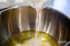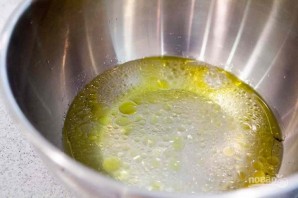 1. Смешайте дрожжи с 70 миллилитрами теплой воды и оставьте на 10 минут. В большую миску вылейте оставшуюся холодную воду, добавьте оливковое масло.