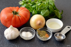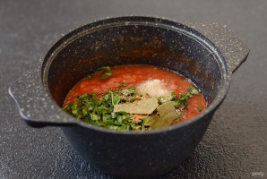 Затем добавьте все специи, мелко порубленную зелень, сахар и соль. Тушите томатный соус еще примерно полчаса, консистенции должна напоминать густую сметану.