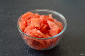 На помидорах сделайте надрез крест-накрест, залейте кипятком, оставьте на 5 минут, затем обдайте ледяной водой. Очистите помидоры от кожицы, удалите семена, нарежьте на ломтики для удобства.