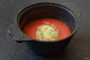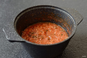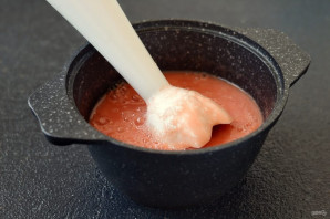 Измельчите помидоры блендером до состояния пюре. Поставьте томатное пюре на медленный огонь и дайте закипеть.