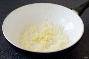 Репчатый лук нарежьте на мелкие кубики и обжарьте в сковороде до мягкости. Зажаривать лук не нужно! Когда лук будет почти готов, добавьте измельченный чеснок и жарьте все вместе 1-2 минуты.