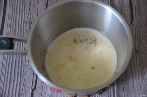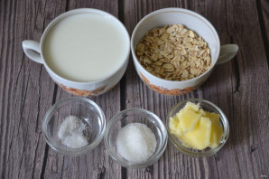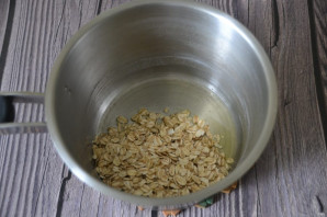 В сотейник с толстым дном положите топленое сливочное масло, всыпьте овсяные хлопья.