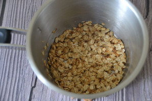 Обжаривайте овсяные хлопья до легкого золотистого цвета, постоянно перемешивая.
