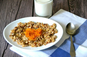 Подавайте жареную овсянку с вареньем, джемом, свежими ягодами, в данном рецепте в качестве дополнения использован морковный джем. Благодаря обжарке хлопьев, каша приобрела приятный ореховый вкус и аромат.