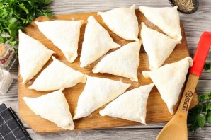 Каждый кусок теста раскатайте в прямоугольный пласт, толщиной приблизительно 5 мм. Поделите на 6 частей. По центру выложите начинку, тесто вокруг начинки смажьте яичным белком и сформируйте самсу любой удобной формы.