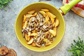 Добавьте к обжаренной картошке маслята, все посолите, поперчите и перемешайте. Обжарьте все еще 2-3 минуты на среднем огне и подавайте на стол.