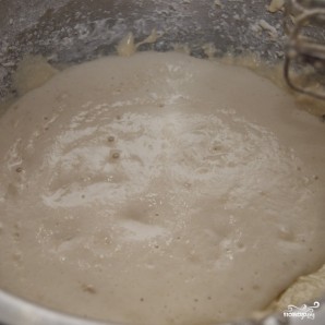 В средней миске взбейте 1 стакан теплого молока, 1/4 чайной ложки соли, сахар, дрожжи и 2 чашки муки. Накрыть полотенцем и поставить в теплое место на 10-15 минут.