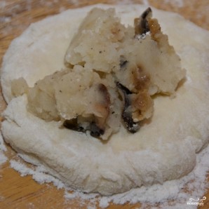 Тесто готово, можно приступать к приготовлению непосредственно жареных пирожков. Тесто получается липким, потому работать с ним лучше всего, смазав ладони растительным маслом. Итак, отщипываем от теста небольшой кусочек, формируем из него лепешку, в центр лепешки выкладываем немного вашей любимой начинки - у меня это картофель с жареными грибами.