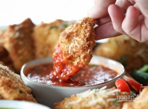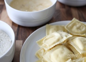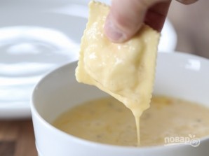 Лучше всего для этого рецепта использовать свежие домашние равиоли. Начинка может быть любой (мясо или сыр), в такой панировке будет вкусным все :) Подавать к столу их можно с самыми разнообразными соусами: томатным, чесночным, песто и т.д. Чудесная альтернатива привычной варке, попробовать стоит
