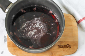 Вишневый сок перелейте в кастрюлю или в казан, всыпьте сахар и поместите емкость на плиту. Доведите до кипения и выключите нагрев.