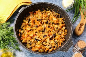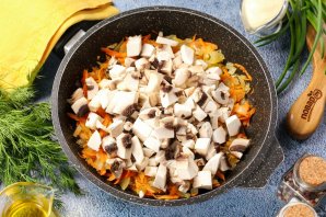 Добавьте нарезанные кубиками грибы. У меня это шампиньоны, но можно взять вешенки или любые другие.