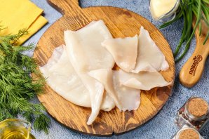Подготовьте все ингредиенты. Тушки кальмаров вымойте и, если это необходимо очистите от пленки. Достаточно предварительно их ошпарить кипятком, чтобы это было легче сделать.