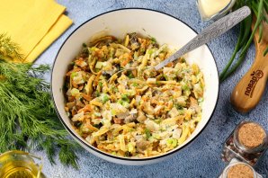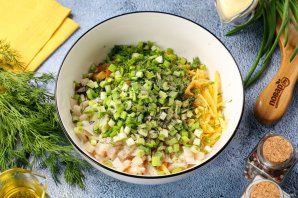 Соедините содержимое сковороды и измельчённые плавники кальмаров. Добавьте тёртый сыр и любую свежую зелень. Посолите и поперчите начинку по вкусу.
